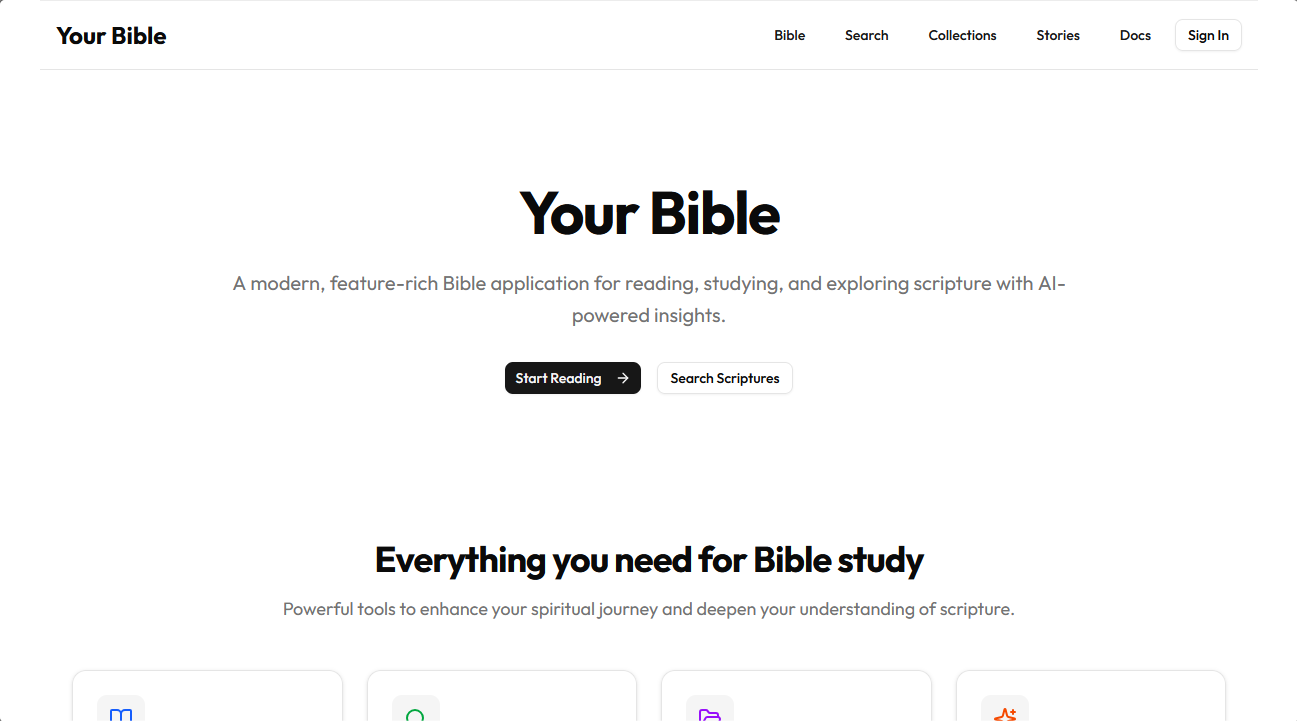A modern, feature-rich Bible application built with TanStack Start, TypeScript, and TanStack Router. Access multiple Bible translations, search scriptures, create personal verse collections, and generate AI-powered stories based on biblical passages.